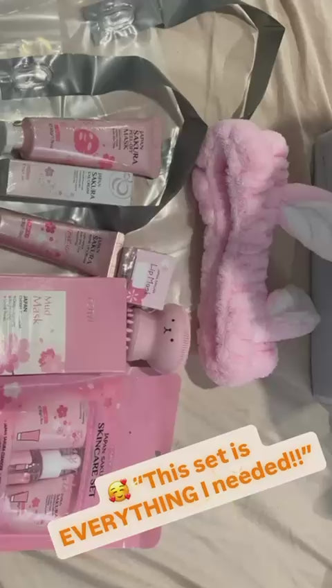 The set includes: Serum, Eye Cream, Tone-Up Cream, Peel-Off Mask, Cleanser, Essence Cream, Mud Mask (12 pcs), Lip Mask & Brush, Hair Bandana, and a Silicone Facial Cleansing Brush.